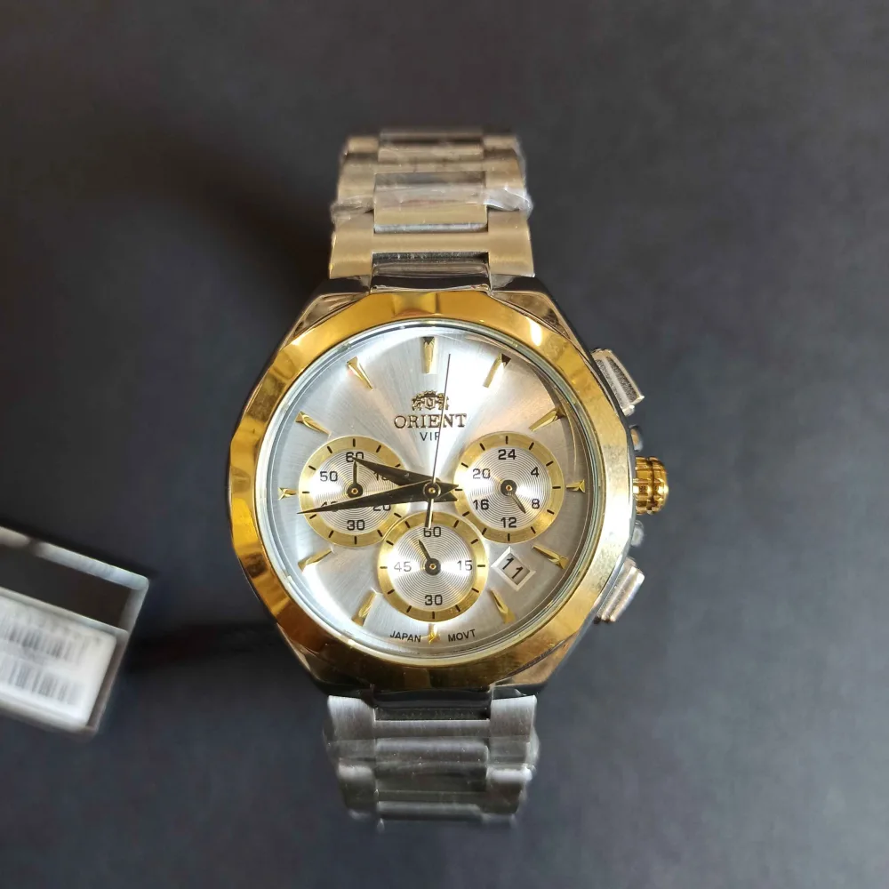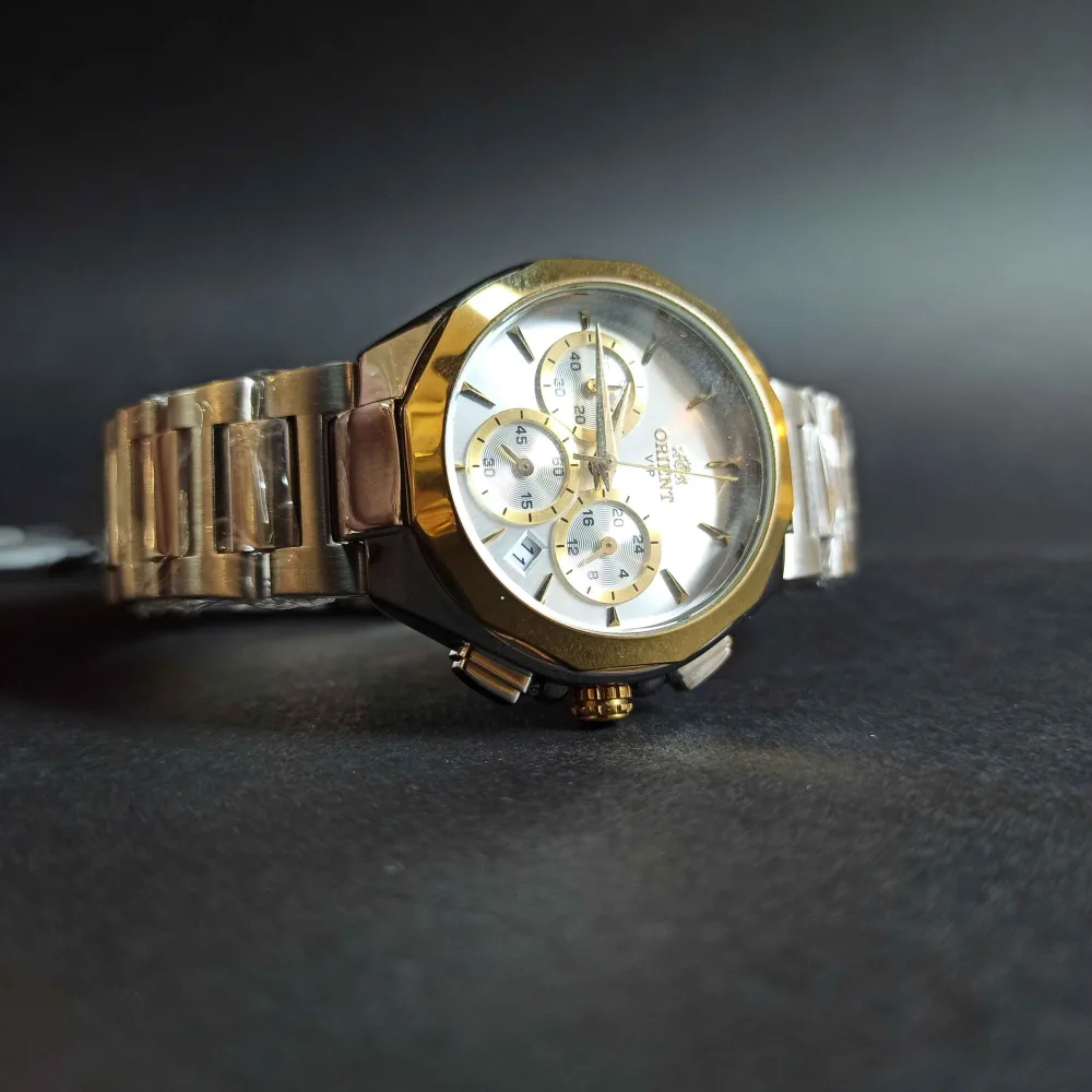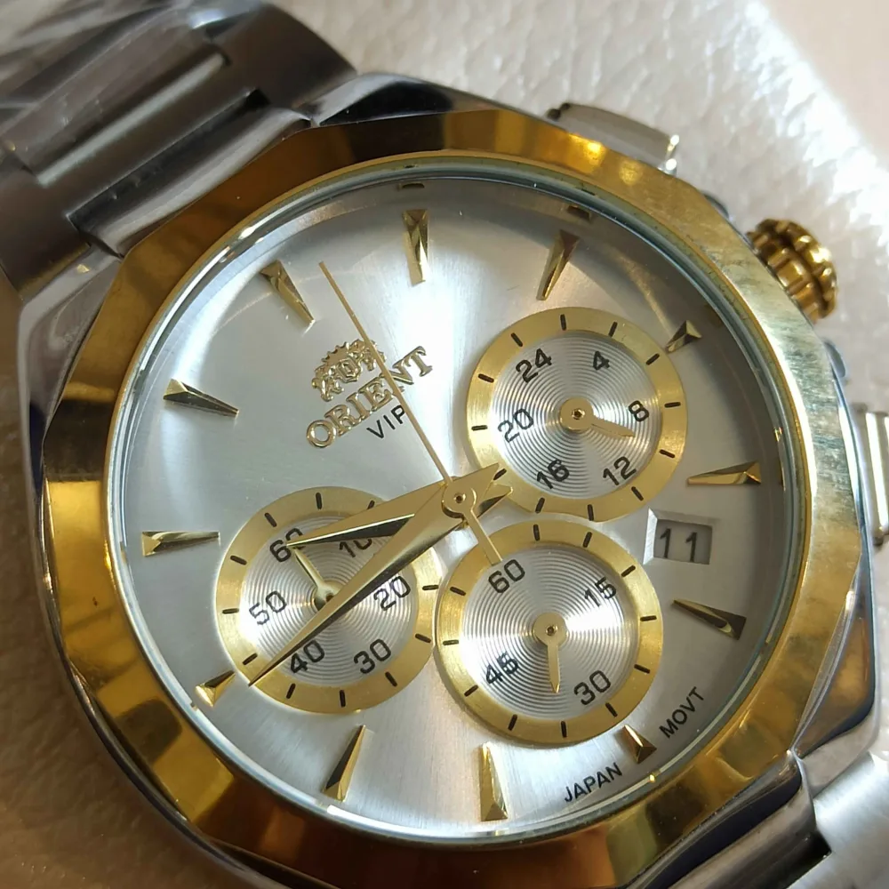 ترکیب رنگ جذاب نقره‌ای بند، طلایی دور قاب و صفحه سفید، جلوه‌ای زیبا و چشم‌نواز به این ساعت بخشیده است. سگمنت‌های سه‌بعدی طلایی و حک برند اورینت داخل ساعت، نشانه‌ای از اصالت و کیفیت این محصول هستند.