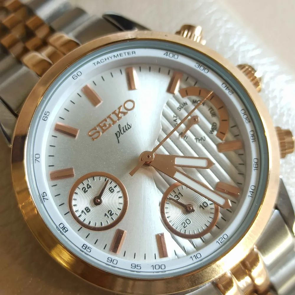 این ساعت زنانه دارای قفل پروانهای است که علاوه بر امنیت، باز و بسته کردن آن را نیز آسان میکند. همچنین تقویم هفتهشمار و سگمنت سهبعدی طلایی، زیبایی و عملکرد این ساعت را تکمیل میکنند. در داخل ساعت نیز حک برند سیکو پلاس بهوضوح دیده میشود.