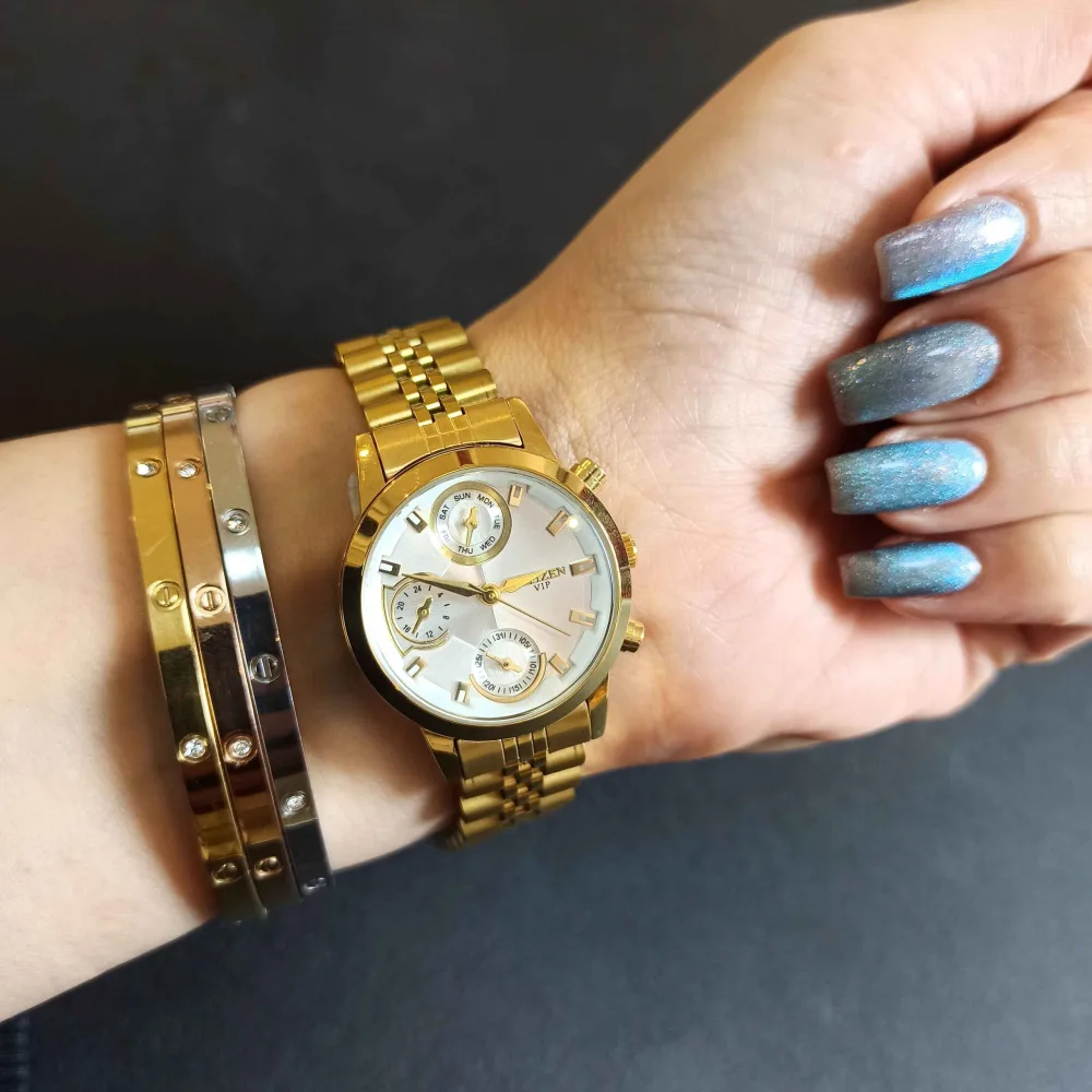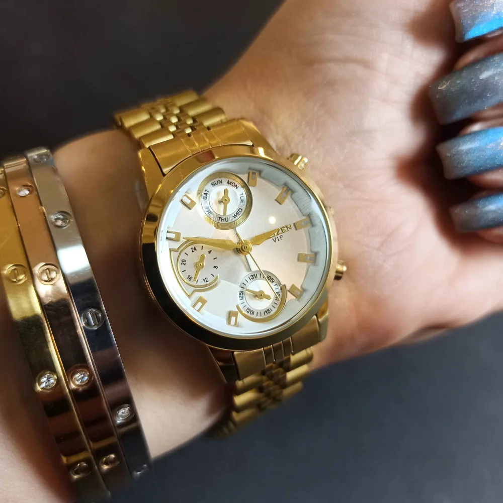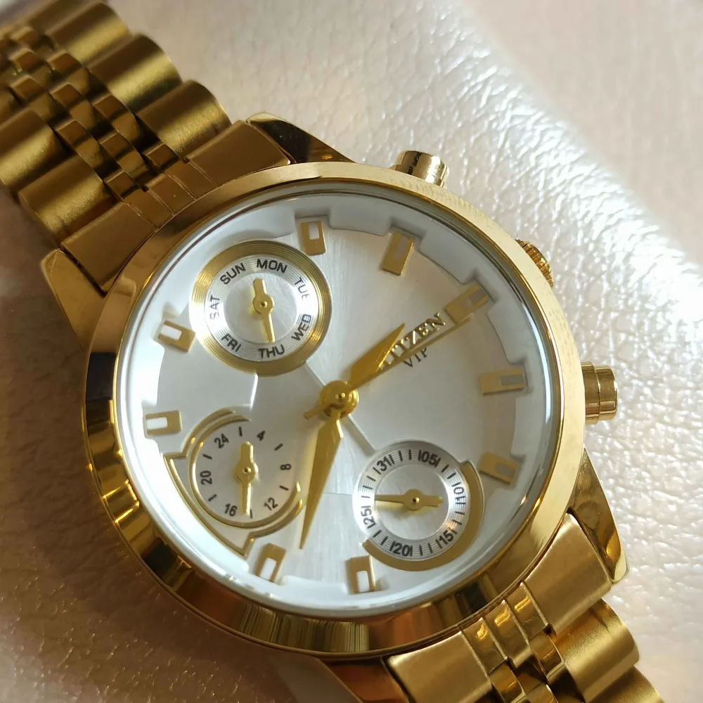 طراحی این ساعت با قطر صفحه ۳۳ میلی‌متر و رنگ طلایی بند و قاب، جلوه‌ای خاص به دست شما می‌بخشد. صفحه سفید با سگمنت ۳بعدی طلایی و حک برند سیتیزن VIP داخل ساعت، ظاهری زیبا و شیک ایجاد کرده است. قفل پروانه‌ای نیز به راحتی استفاده و ایمنی بیشتر کمک می‌کند.