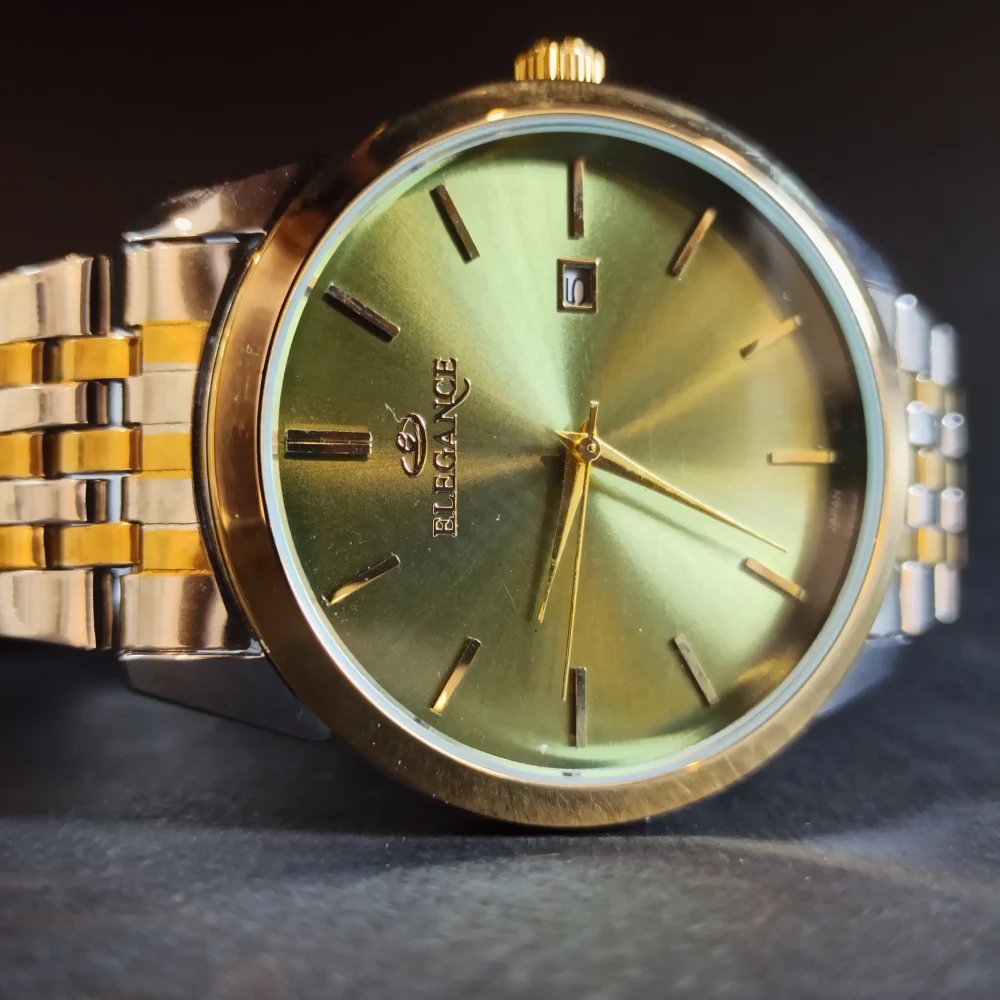 قطر صفحه ساعت 43 میلیمتر بوده و وزن دقیق آن 158 گرم است که حس راحتی و تعادل را هنگام استفاده به کاربر منتقل میکند. ترکیب رنگهای نقرهای طلایی در بند، طلایی در دور قاب و سبز در صفحه، جلوهای خاص و لوکس به این ساعت داده است. حک برند الگانس داخل ساعت نیز اصالت و کیفیت بالای این محصول را نشان میدهد.