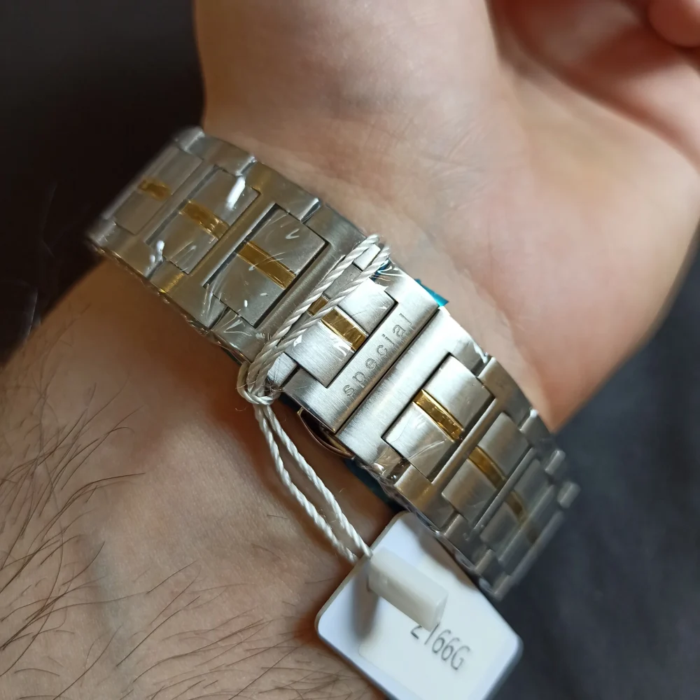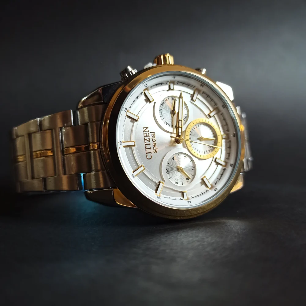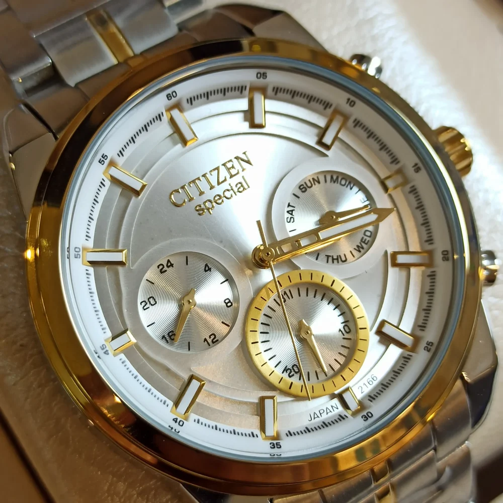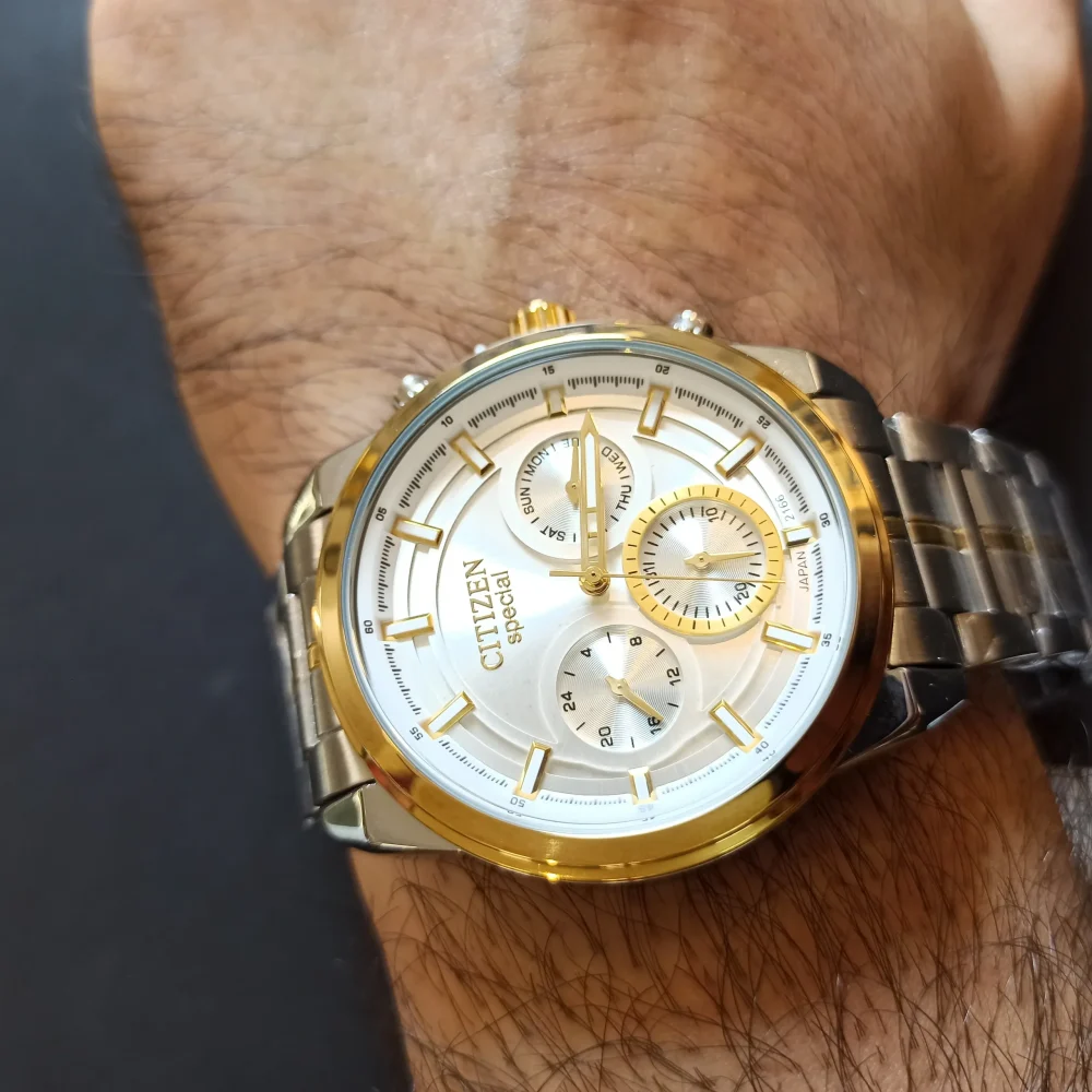 این ساعت با قطر صفحه 43 میلی‌متر و وزن 158 گرم، کاملاً متناسب با مچ دست آقایان طراحی شده است. ترکیب رنگ نقره‌ای و طلایی در بند و طلایی در دور قاب، همراه با صفحه سفید، جذابیت بصری ویژه‌ای به این ساعت بخشیده است. همچنین، حک برند سیتیزن داخل ساعت، اصالت و اورجینال بودن آن را تأیید می‌کند.