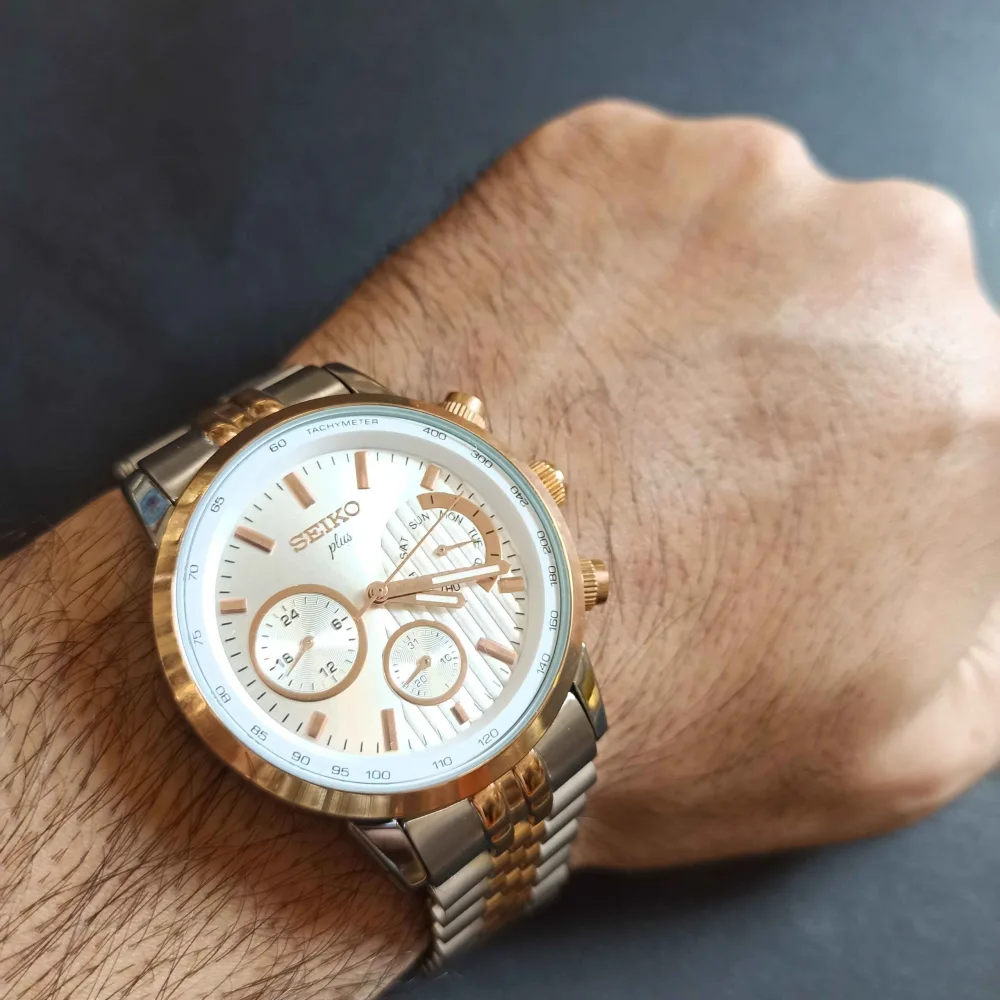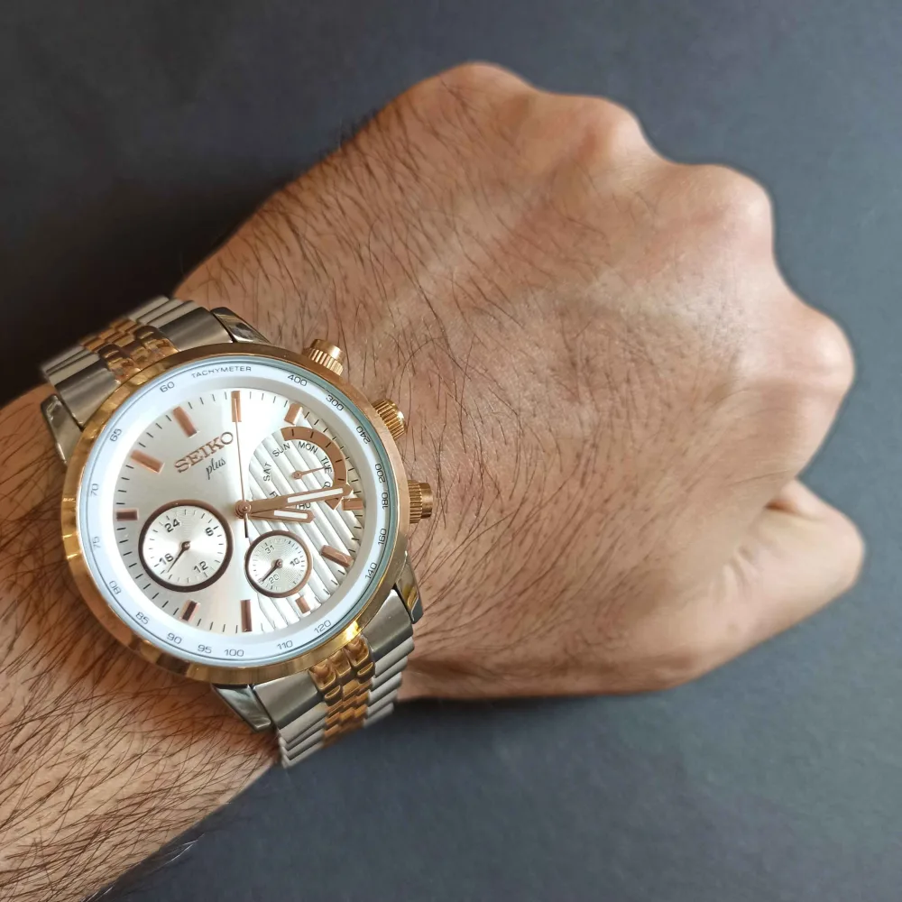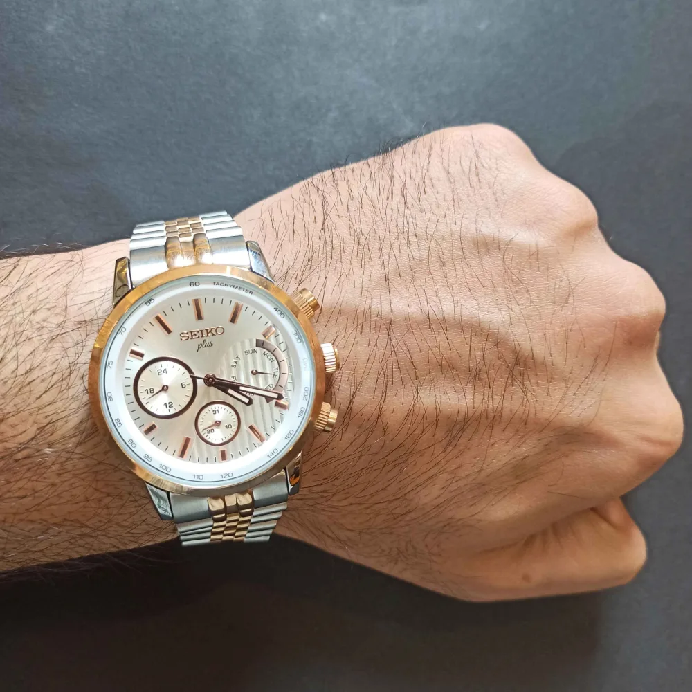 این ساعت با طراحی سه‌بعدی طلایی سگمنت و قطر صفحه ۴۳ میلی‌متری، ظاهری شیک و جذاب دارد. رنگ بند نقره‌ای ـ طلایی و دور قاب طلایی، جلوه‌ای لوکس به این ساعت بخشیده است. همچنین، حک برند سیکو پلاس در داخل ساعت، اصالت و کیفیت محصول را نشان می‌دهد.