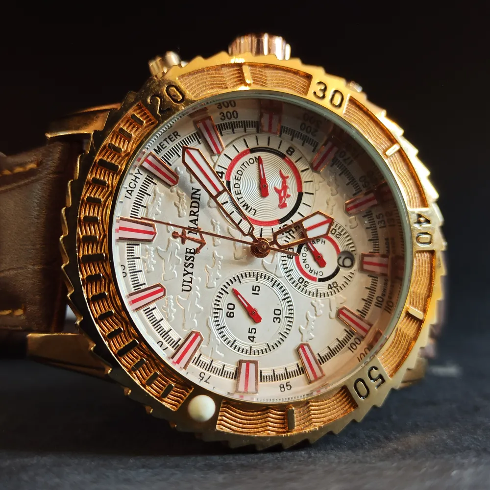 این ساعت با بهرهگیری از سه موتور قدرتمند کرنوگراف، عملکردی دقیق و بینقص ارائه میدهد. جنس بدنه از استیل ضد زنگ است که دوام و درخشندگی آن را تضمین میکند. بند ساعت نیز از جنس چرم طبیعی بوده که علاوه بر راحتی، جلوهای لوکس به آن بخشیده است.