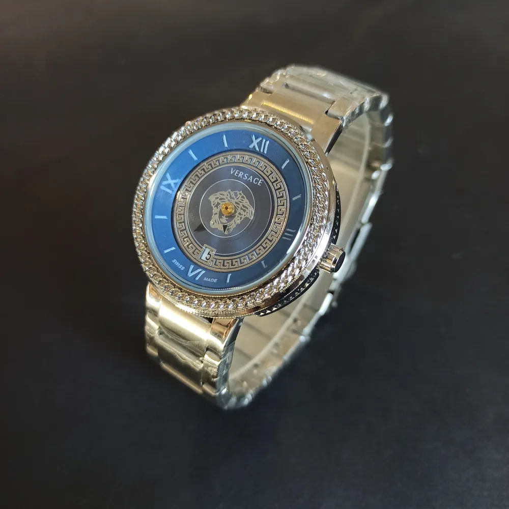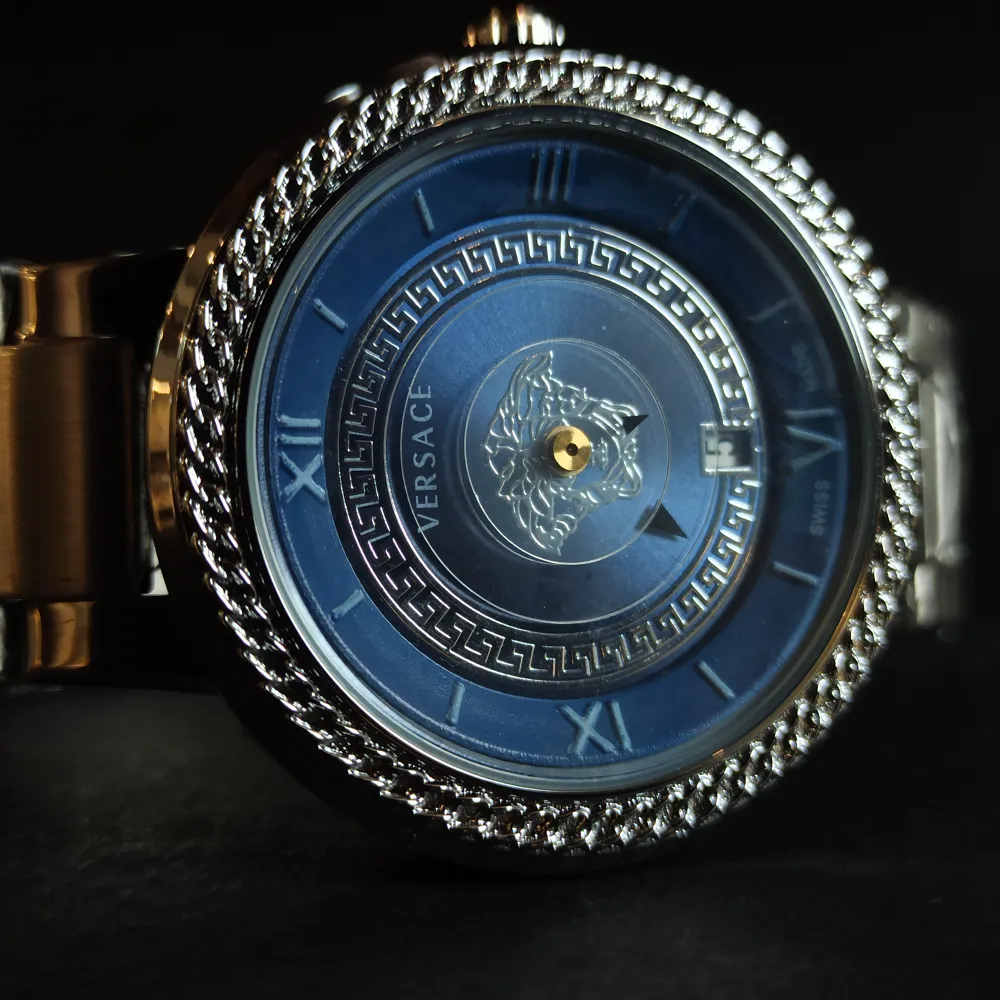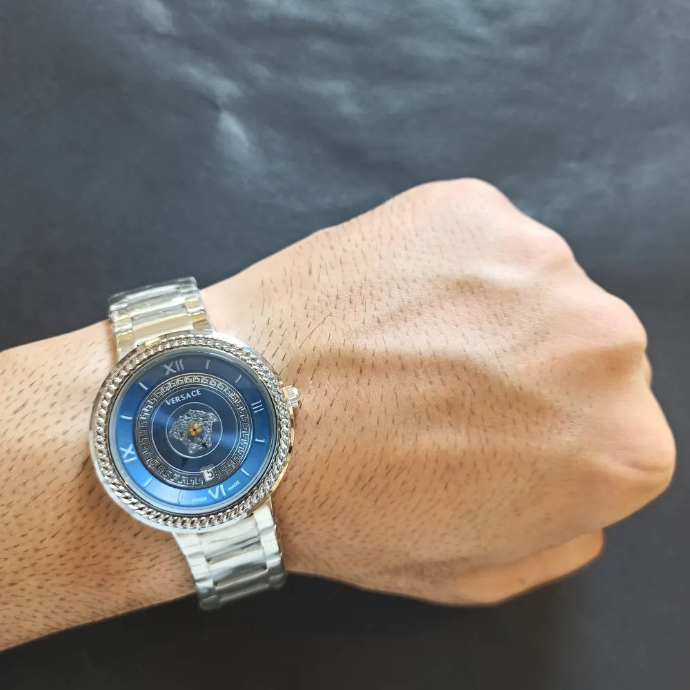 طراحی صفحه این ساعت بسیار ظریف و با جزئیات دقیق انجام شده است. لوگوی برند ورساچه بهطور برجسته روی صفحه ساعت قرار گرفته که جذابیت خاصی به آن بخشیده است. همچنین، ترکیب رنگهای زیبا و استفاده از عقربههای شبتاب، این ساعت را به یک انتخاب ایدهآل برای استفاده در هر شرایطی تبدیل کرده است.