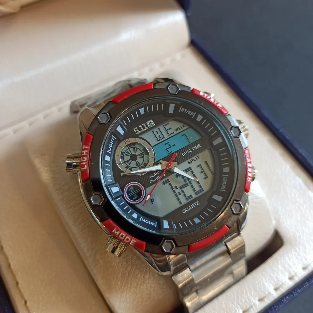 این ساعت با قاب و بند فولاد استیل ۳۰۴ ساخته شده است که علاوه بر مقاومت بالا، دارای رنگ ثابت و ضد زنگ نیز میباشد. شیشه کریستال ضدخش آن، به خوبی از صفحه ساعت محافظت میکند. رنگبندی خاص این مدل شامل بند نقرهای، دور قاب قرمز و صفحه مشکی است که جلوهای شیک و جذاب به آن میبخشد.