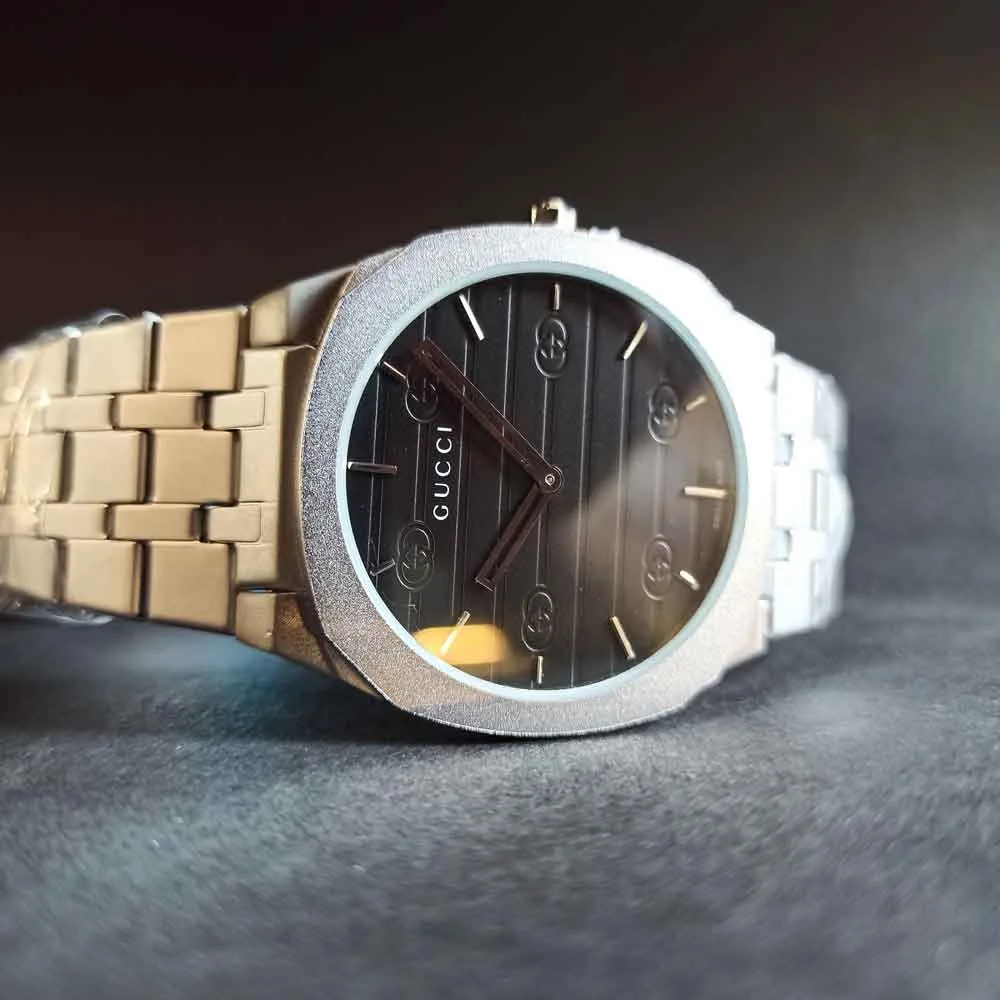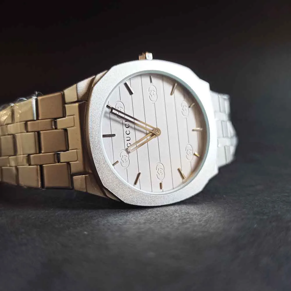 مدل قفل این ساعت از نوع کلیپسی است که استفاده از آن را بسیار راحت میکند. طراحی سهبعدی صفحه ساعت با قطر 39 میلیمتر، جلوهای مدرن و جذاب به این محصول بخشیده است. همچنین، حک برند گوچی روی ساعت، اصالت این محصول را تضمین میکند.